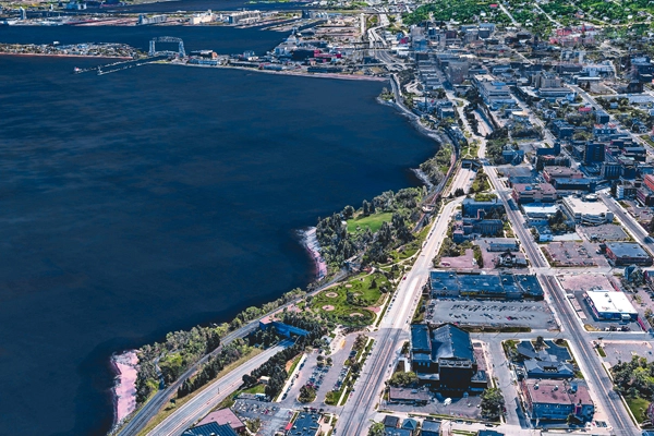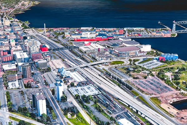 The city of Duluth lies where the Great Lakes begin. Lake Superior stretches out from its shores towards an infinite horizon, while the city’s downtown straddles steep hills abutting the waterfront, creating a sort of urban amphitheater with the lake taking center stage. In spite of this visual relationship, the city and the waterfront have been historically disconnected from each other in the physical capacity. Industrialists were quick to develop the city into the world’s farthest inland port, and with this development came the privatization, and then pollution, of much of the city’s waterfront. Eventually economic tides turned and the port began to retract into the harbor, leaving a shoreline of scrapyards and dirty water, the perfect place to build an interstate highway—perfect according to the Minnesota Department of Transportation (MnDOT) planners, at least.