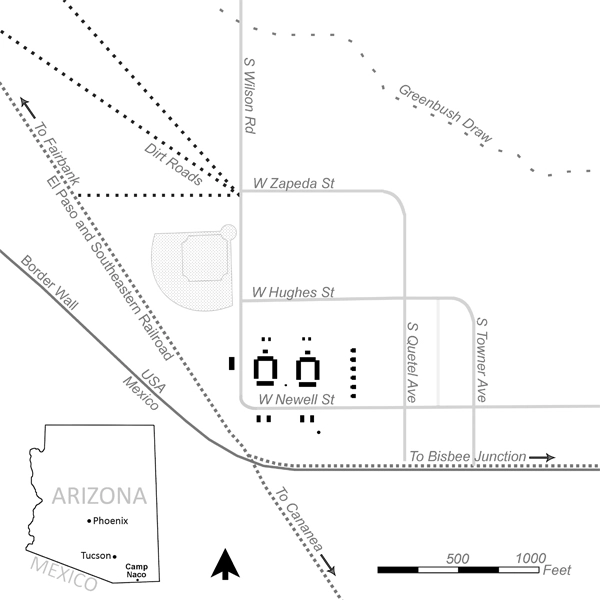 Camp Naco lies in the valley of the San Pedro River of southeastern Arizona, between the Huachuca Mountains and the Mule Mountains. Set some 300 feet from the wall that now runs along the border between the United States and Mexico, its adobe buildings bring to mind an unsettled decade at the beginning of the twentieth century when Mexican revolutionaries, striking mine workers, lawless bandits, and a World War I intrigue between Germany and Mexico dominated the political landscape. During the greater part of its history, the camp was home to rotating troops from the 10th U.S. Cavalry Regiment, nicknamed the “Buffalo Soldiers.”