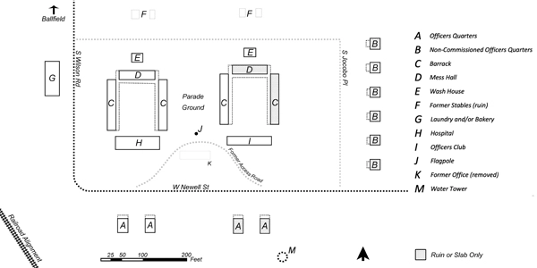 Behind the barracks to the north were community bath houses, and behind them were the stables (now ruins). A laundry and/or bakery was located across the street from the barracks. North of this building was a baseball diamond, baseball being a popular pastime during the first half of the twentieth century. It appears that no efforts were ever made to landscape the grounds, likely because of the rotating population.