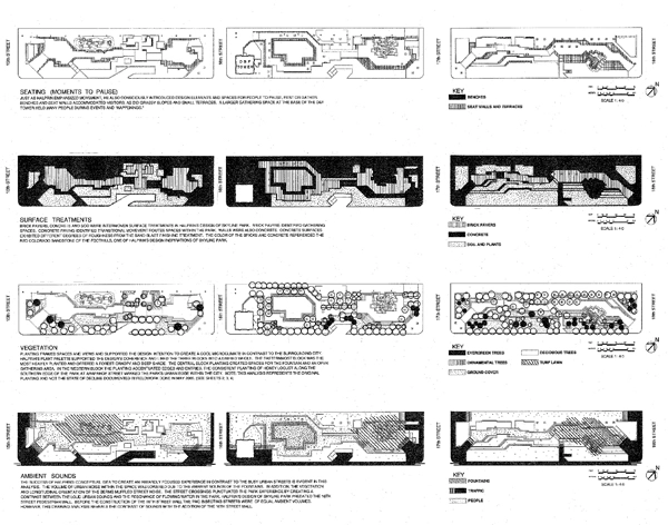 Halprin’s three-block design was sunken below street level and heavily planted along the edges. Concrete elements such as retaining walls, stepped seating walls, planters, and abstract fountains were the park’s most distinctive features. Each block included a major water feature, which were intended to invoke Colorado’s mountain setting.