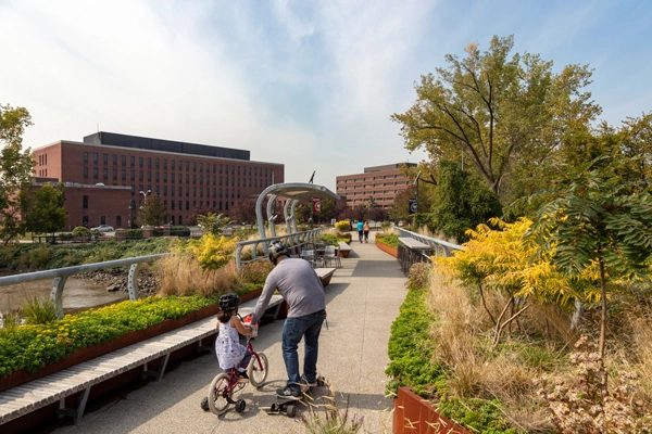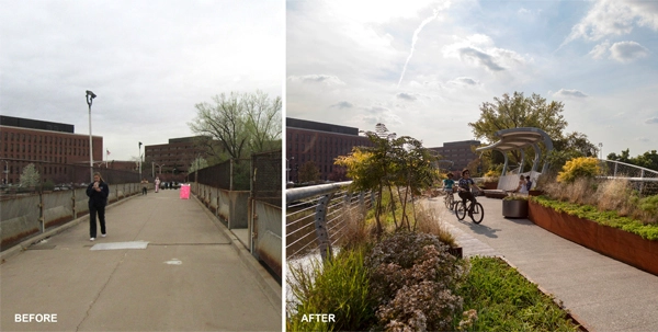 Planting was designed as a green roof system. Linear Corten steel-sided planters run the full length of the bridge and support a series of linear recycled teak benches. The massings of native plants cool and soften the path edges, improve the view over the river, and frame spaces for gathering. Planters are insulated with foam to save weight and protect against winter freezing. They rest on a steel frame that allows for temperature fluctuations and bridge movement; some are even suspended over the outside rail. Hardy, drought-tolerant plants include a variety of native perennials and low shrubs. Fragrant sumac creates height and lends interesting shapes.