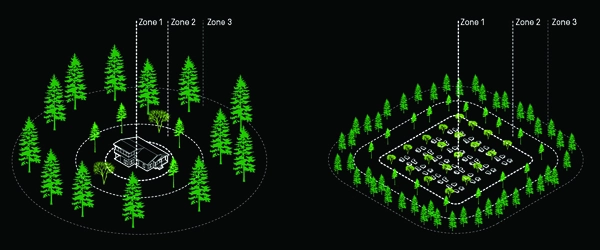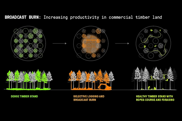 Taking this idea even further, a team of researchers and landscape architects at SWA Group have proposed a strategy for using these greenbelts as a spatial framework for reintroducing prescribed fire into the landscape in order to reduce regional fuel loads while simultaneously enhancing the ecological health of densely forested areas. The proposal leverages existing roadways, ridgelines, and utility corridors as a network of fuel breaks, and identifies a range of strategies for using mechanical thinning, animal grazing, controlled burns, and native planting to establish a 90,000-acre zone of protection that can be tailored to the specific landscape performance objectives of various regional stakeholders.