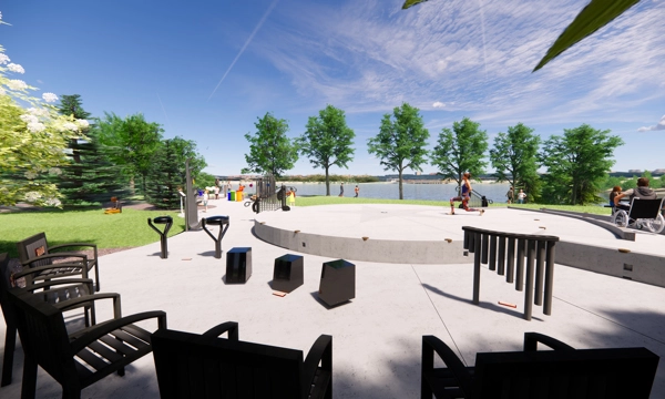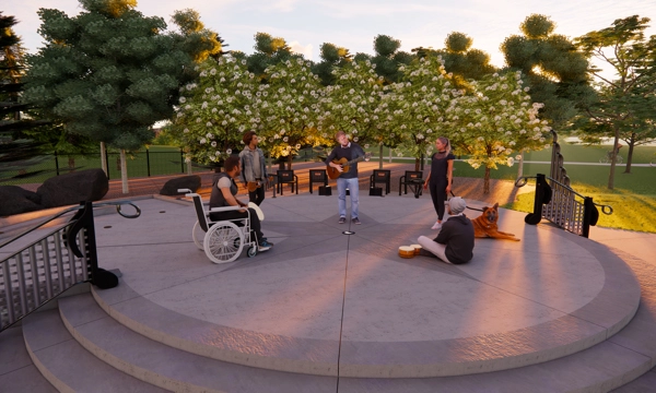 At the heart of the park is an accessible concrete stage with a five-pointed star design containing a single light in the center lit skyward. The stage welcomes everyone from impromptu dance performances by families, to scheduled events for larger crowds picnicking in the adjacent large grassy area. Five uniquely designed chairs sit below five flowering trees overlooking the stage creating a peaceful space to sit and take in the beauty of nature and the hum of the park.
