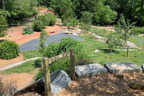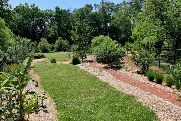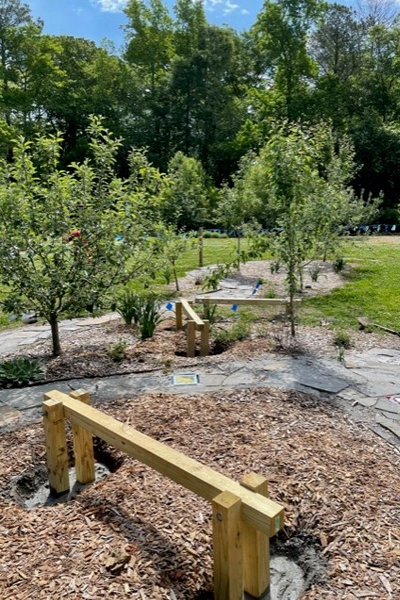 Now in its fourth year, the orchard-playground continues to grow thanks to volunteer efforts. There are approximately 150 fruiting plants, which include various cultivars of apples, pears, peaches, figs, muscadines, blackberries, persimmons, loquat, che, feijoa, hardy kiwi, blueberries, and goumi. With periodic maintenance, they are increasingly bearing fruit, and a new children’s play area is currently under construction to enhance the nature play experience for children and families. It will feature balance beams, a new interactive water play feature, a musical instrument, a sand play area, tree stump steps, and a small elevated playhouse with a tunnel underneath.