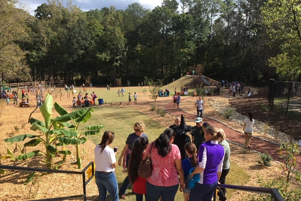 The notion of a public orchard where fruit is grown for free harvest by the community is a logical extension of the community gardening movement that is increasingly being explored throughout the country. During the design process, there was little information regarding public orchards, but as of now, there are numerous efforts in Georgia and around the US. Some go by the name of “food forest,” which can be a combination of orchard and annual fruit and vegetable growing, and some follow the concept of “permaculture,” which relies on dynamic and symbiotic relationships between edible plants and their allies to develop a long lasting and self-sustaining harvest. While these concepts were explored during the design process, the planting design was simplified for the initial phase based on available budget and anticipated maintenance capacity. Thus, the outcome was creation of a combination of pathways, benches, fences, play features, lawn areas, and mulched fruit tree, shrub, and vine areas.