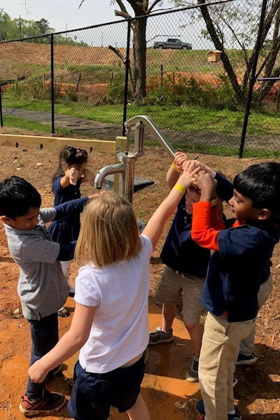 The granite cobble-lined pathways are composed of bright red crushed terracotta, which has a unique feel, is easy to traverse over, and adds to the brightness of the space. A Bison-brand hand water pump gives children and adults the opportunity to fill up buckets and water plants or to play with the water there at the station.
