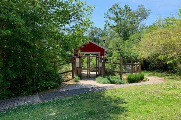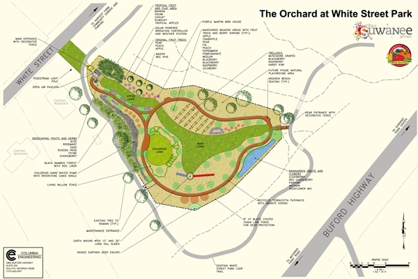 In Suwanee, a small suburb north of Atlanta, Georgia, lies a one-acre public park combining edible fruiting plants with child-friendly play features. Suwanee has a small but popular parks network that includes a seven-acre site with an organically maintained community garden, stream, trails, and a lawn that was a former pasture. In 2012, a local landscape architect met with City staff to discuss the potential to convert the former pasture area into a new kind of park for the City—an “orchard-playground.” The concept was intended to combine the enjoyment of edible fruit with play features rooted in the natural playground movement. After several years of both volunteer- and employer-supported efforts, the City approved a final design, and the Orchard at White Street Park was constructed and officially opened in the fall of 2017.