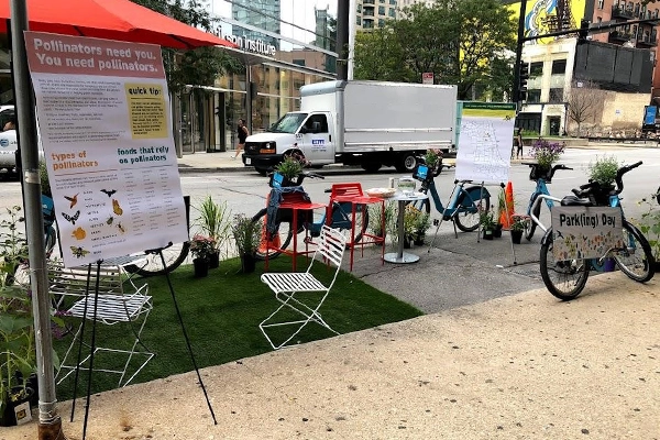 A few years back, while working at a design firm in Chicago’s dense River North neighborhood, co-workers and I used Park(ing) Day as an opportunity to secure space from cars and reclaim it in the name of pollinators. Included in our installation was information on food reliant on pollinators, types of pollinators, and pollinator fun facts. We also handed out packets of pollinator-approved plant seeds. Folks who participated added a bee pin to our pollinator network, as we promoted creating your own urban pollinator garden. Park(ing) Day is a wonderful opportunity to reclaim space and promote sustainable systems for folks across all cities.