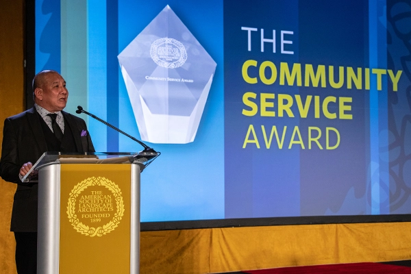Recent Community Service Award winners: Ernie (Ernest) Wong, FASLA; Glen Dake, FASLA; Kimberlee Douglas, ASLA; John T. Lyle Center for Regenerative Studies; DesignJones, LLC; Martin Barry, ASLA; Randolph Hester Jr., FASLA; William L. Flournoy Jr., FASLA