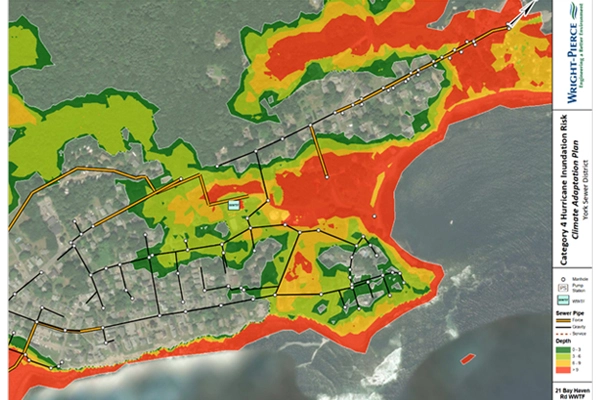 Through the next few decades, these strategies will help take the current built environment and transform it by promoting economic opportunities for projects that support their surrounding natural systems. Wastewater is one of these major infrastructures that are at high risk from the rise in sea levels. This is due to facilities that are commonly located at low elevations to fulfill gravity sewer requirements. In the presentation given by Carlson, an example was provided of a community that is at risk to sea level rise: York, ME (see Figure 1: Aerial of York, ME Coastal Community). Flooding of these systems will cause damage to the equipment at these stations and result in unhealthy conditions to the environment and the communities that it serves. The rise in sea level has also resulted in a concurrent rise in the water table, inundating existing stormwater systems and rendering them unable to function properly (see Figure 2: York, ME Category 4 Hurricane Inundation Risk Climate Adaptation Plan).