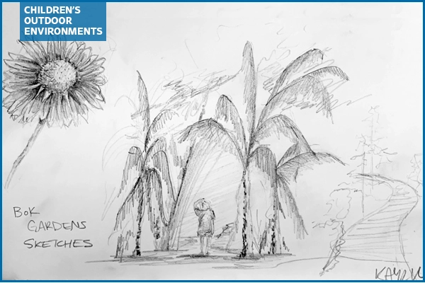 Unfortunately, children’s play spaces often take a back seat in design education. Case studies often shed light on audience demographics but there is typically limited focus on the littlest clientele. To our educational detriment, the extent to which students are expected to include play spaces in a project may entail merely finding an existing AutoCAD file for a playground. As a result of this, as my classmates and I wandered around the children’s play space at Bok Tower Gardens with our pencils poised to capture the design and underlying intent, we realized that uncovering the true mastery of children’s play spaces would be trickier than initially imagined.