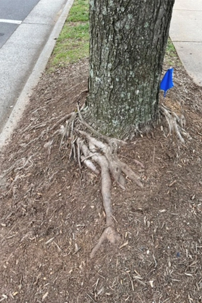 Besides the expansion of built surfaces within and along the edges of cities, trees in urban settings face other challenges. Age and declining health due to urban stress, poor understanding of plant physiology, and pests and diseases all contribute to the decline and loss of tree cover (see photo below). In Charlotte, NC, the large, cathedral ceiling created by the willow oaks has experienced damage, while canker worms and the emerald ash borer has decimated the ash tree population. City maintenance leaves mounded mulch against tree trunks instead of creating reservoirs for water and air at the tree flare, and this increases damage to root systems and allows the introduction of fungus and pests. Storms and ice cause broken limbs and weak trees to fall. These challenges to tree health and overall canopy cover creates fragmentation of important ecosystem services, such as increased heat absorption by bare soil as well as the introduction of new impervious surfaces that exacerbate heat stress on urban populations.