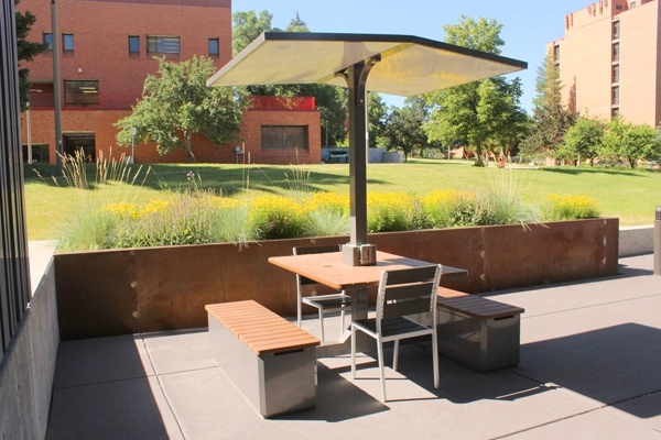 At universities and colleges, solar workstations with an array of PV cells in the form of a large canopy, centrally mounted over a table and bench seats, are providing additional opportunities for students to meet and work outdoors, even after dark. The large panels not only provide some protection from the sun and rain, but supply sufficient power for overhead night lighting, USB and Qi phone charging, a Wi-Fi hotspot, and 120V power outlets for devices with transformers, such as laptops.