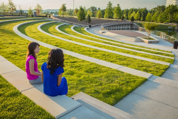 This project was particularly exciting, as HGOR won an invitation-only competition to define this future Class-A office environment. Key initiatives included creating a strong sense of identity and defining how landscapes and buildings sustainably respond to each other while respecting and preserving the natural environment. To allow for flexibility and connectivity, we designed a central amphitheater suitable for large events and over 2.5 miles of trails and networks that link the buildings within the Franklin Park complex, enabling enhanced social connection. To maximize sustainability and the significance of water as a valuable resource, we integrated a water resource management plan which includes seven natural drainage basins across the overall property. Each outdoor amenity component was thoughtfully and carefully worked into the natural drainage basins to promote infiltration and reduce the dependence on traditional buried stormwater infrastructure.