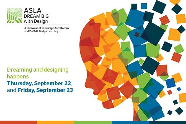 Scheduled for Thursday, September 22, and Friday, September 23, DREAM BIG with Design will highlight the exciting world of landscape architecture with fun sessions and resources for students in grades preK-12. PreK-12 teachers, school counselors, after school leaders, family members, and design professionals are invited to attend.
