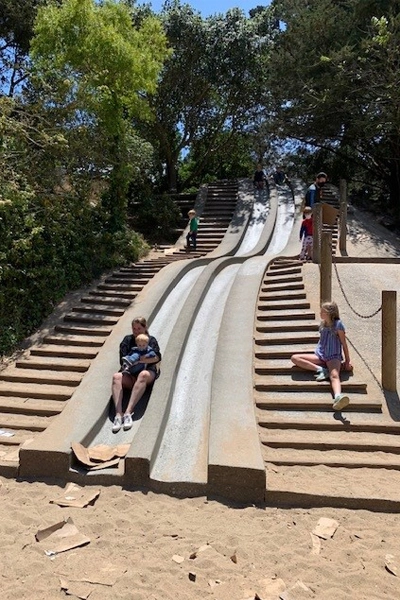 The concrete slides: this general concept of a concrete slide seems unique to Northern California, and I have great childhood memories of exploring them across the Bay in Berkeley with cousins. It is truly the perfect combination of unique design and craftsmanship with functionality and attractiveness for children. At this site, children scale up the tined concrete and built-in wooden stairs bringing various scraps of cardboard to sit on and try to navigate the perfect ride down. It’s a side-by-side double slide, so children can race down or at least one person can’t jam the whole attraction. It offers a similar but unique experience in every ride based on the child’s ability to control their body with the smoothly worn grooves of the slide and their individual cardboard piece. It feels like the same principle as surfing, where the infinite variability of each attempt creates a memorable and unique experience and drives a desire to improve for the maximum pleasure. This slide was endlessly busy. As an embankment slide, the risk was low and in over a hundred trips I watched, I saw only one bruised wrist. Most children observed were between ages 5-12. A few younger children tried and had difficulty with the agility and control needed to ride the cardboard down. My inner child wanted to ride again like the old days, but I was overcome by physics, as there appears to be a balance of weight and friction that children have and most adults just don’t. There’s something so special and uniquely Californian about these concrete slides, and I highly recommend seeking out one of these old gems that are buried across hills all around the Bay Area.