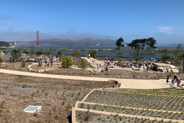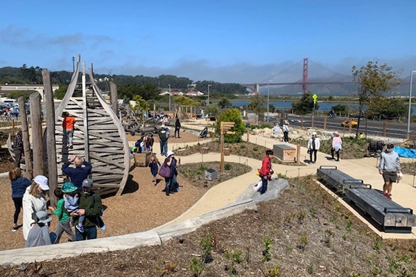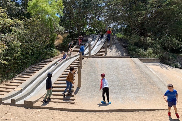 As a landscape architect with four young children, I enjoy visiting unique and dynamic playgrounds wherever I travel. This summer, I had the good fortune of traveling to San Francisco, and I wanted to share my thoughts on a few playgrounds I visited for anyone thinking about the topic of children’s outdoor play as they head to San Francisco for the ASLA 2022 Conference on Landscape Architecture. It’s by no means an exhaustive list, and hopefully my experiences will be a motivating factor for others to get out and explore unique outdoor spaces in the Bay Area and beyond.