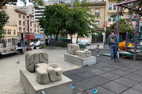 Portsmouth Square Park is a historically significant park in the heart of Chinatown. It was the first public square of San Francisco and only blocks away from the iconic Transamerica building. The playground areas in the park are generally old and poorly maintained with aging manufactured equipment. It is somewhat broken up by stairs and fencing, and a parking garage is located underneath.