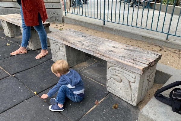 Sea serpent mosaic through a sand area: the artistry is beautiful, but generally the fun my children found was jumping off the elevation change it creates from surrounding landscape areas to a sand pit below. It’s a unique piece of art with a high level of detail that may be more appreciated by parents than children.