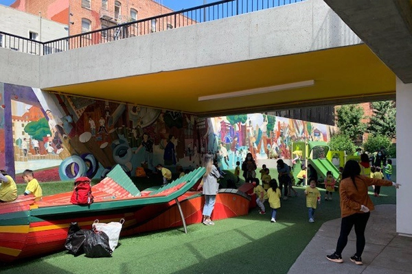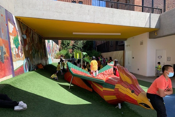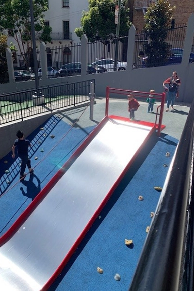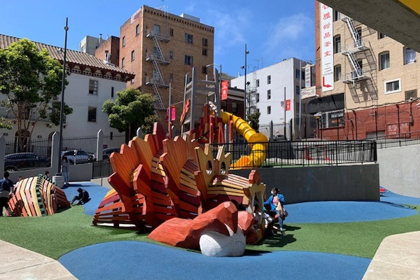 Located a few blocks from Portsmouth Square in Chinatown is a park that was extensively remodeled in 2020 and named for a local basketball legend and later community advocate Willie “Woo Woo” Wong. Earthscape Play designed the Chinese mythology dragon and phoenix climbable play structures, and Jensen Architects put together this creative multi-level outdoor space that is integrated with a nearby community center providing a variety of services and outreach programs.