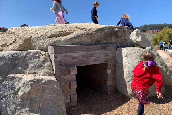As the newest and most elaborate play space and sitting near the foot of the Golden Gate Bridge, the Tunnel Tops Playground in the Presidio will be heavily featured in any forum discussing children’s play in San Francisco. My observations are that the sequence of spaces and character of materials is beautifully modern and appeals to the modern natural playground themes of stone, sand, water, rope, and wood. The vistas from above the play area are amazing, and the contoured wooden benches are gorgeous and fun, but let’s focus on the dedicated children’s play space. It is roughly an acre in size and has some winding paths with narrower offshoot pathways creating some fun alternate routes to the spaces. There are features in each distinct play pod area including climber wall, sand and water play, loose parts play, climbers made of finished tree sections, a boulder covered tunnel, sand pit, rope swinger, and a polished concrete slide.