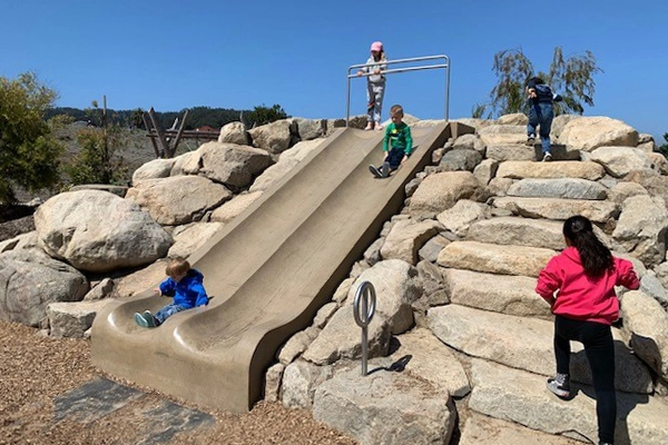 Generally, the area is flat with some moderate earth mounding and open with some canopy trees needing a few years to establish shade. The exposure could be intentional to provide safety related visibility or some other necessary function, but it is somewhat detrimental to the site in terms of the mystery and excitement of the sequence of spaces as well as availability of shade on a sunny day. The tallest features are the log-jam climber at about 15’ height and the embankment concrete slide and climbing wall at about 8-10’ height each. The slide is likely an homage to the California concrete slide style mentioned earlier, but being polished and straight, it functions like a typical slide and doesn’t offer a range of challenge and opportunity or necessitate cardboard. This may just reflect modern safety standards or a desire to not have cardboard littered around the park.