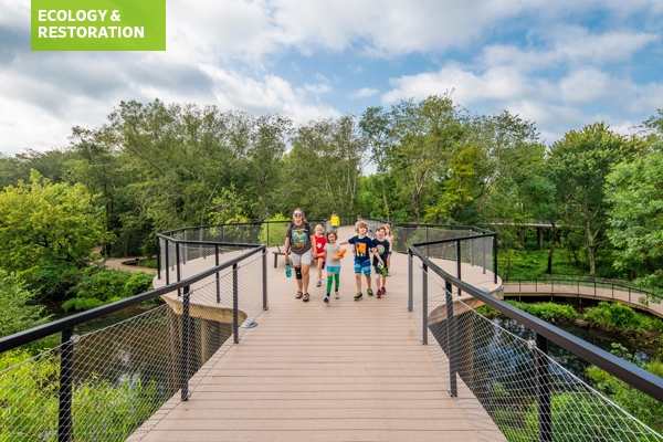 Chattahoochee Nature Center (CNC) in Roswell, Georgia, has long been a destination for wildlife enthusiasts. In fact, despite the pandemic slowdown, many individuals' strong support and partnerships with a desire to revitalize the facility allowed fundraising to reach $6 million for the facility's renovation. The main focus was to connect with nature while minimizing the impact on the site's natural topography. Two projects, the redesign of the 3,000-foot boardwalk and a new pedestrian bridge connecting CNC to the river boardwalk, have transformed the facility while enhancing access to the Chattahoochee River and its environment and preserving the terrain. Along with the improvements to the boardwalk, the wetland had an array of appropriate native species replanted to help mitigate the ongoing removal of invasive species currently existing.