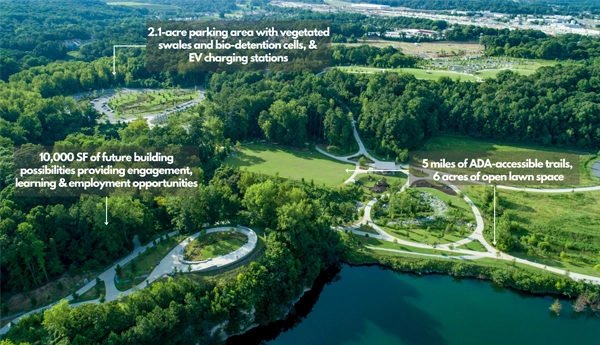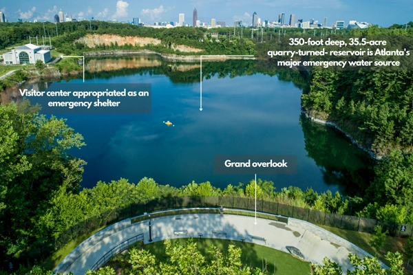 One of the park's unique attributes, a 35.5-acre quarry-turned-reservoir implemented by Atlanta Watershed Management, is now Atlanta's major emergency water source, increasing city water reserves to 30+ days in times of drought. Additional green infrastructure integrated within Westside Park includes a 2.1-acre parking lot with vegetated swales and bio-detention cells, EV charging stations, and native plants chosen specifically to re-establish the park's canopy coverage. Over 8 acres of invasive species, including Kudzu and Chinese Wisteria, were removed towards the greater effort of preserving this urban oasis as one of the largest contiguous intact forests within the city.