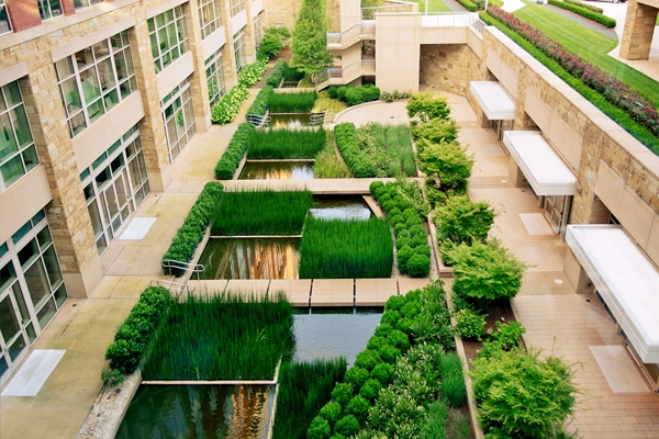 A landscape architect's role is also to play a vital part in helping to address global challenges— by thoughtfully integrating green infrastructure elements and other environmental preservation strategies whenever AND wherever possible. These methods involve the integration of natural, enhanced, and engineered assets. Natural assets, such as meadows, parks, tree canopies, soil, and wetlands, include the living and organic tools of the trade. Enhanced assets—which fall under low-impact development, including green roofs, bioswales, urban tree planting, and stormwater ponds—are utilized in various landscapes, ranging from workplace to multifamily to park environments. Engineered assets include permeable pavement, cisterns, and infiltration trenches.