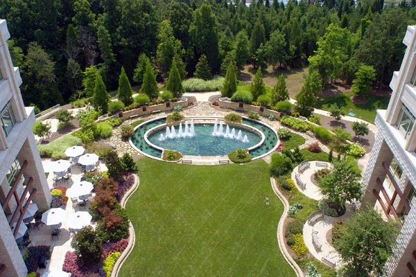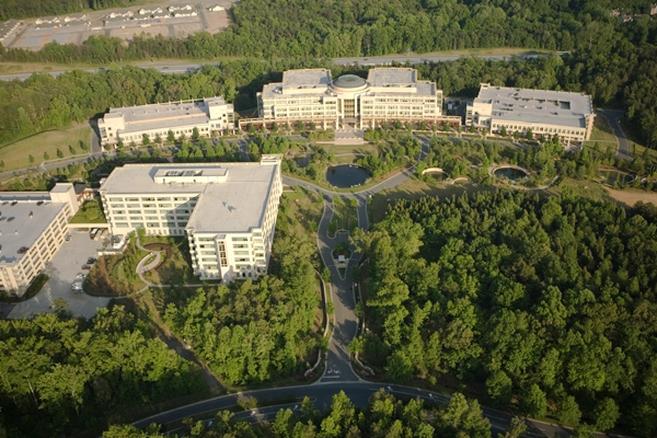 The master plan for TIAA-CREF's 137-acre headquarters included several outdoor experiential opportunities, exhibits from a corporate art program, and educational displays; environmental preservation was integrated as well. The master plan placed new construction along the edge of a broad ridge, preserving valuable hardwood areas and focusing the campus around an 8-acre central green park that introduced the employees, relocating from New York, to the natural beauty of North Carolina.