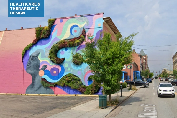 The positive outcomes associated with living walls are multifaceted and societal. A recent study found that installing living walls in classroom-learning environments could facilitate project-based curriculum development, connect students interactively with indoor nature, and have the potential to inspire real-world thinking related to science, technology, engineering, art, and mathematics [13]. A living green wall mural, designed by ArtWorks, was created in the historic district of Cincinnati to brighten the neighborhood through creative placemaking. The living mural, named Looking to Tomorrow, incorporates a built-in irrigation system that supports the plants to grow and thrive, becoming a metaphor of “the literal and figurative growth of the community.”