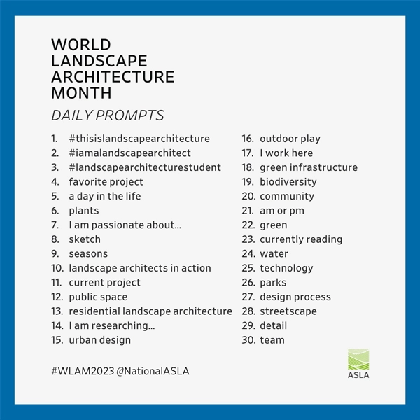 For downloadable WLAM2023 logos, a social media toolkit, and more ways to take part in World Landscape Architecture Month, visit asla.org/wlam2023.