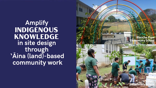 Co-leading a series of participatory design processes with phenomenal Marketing and Communications Director Erin Emerson that all prioritized ‘Āina (land)-based indigenous knowledge as a design foundation to transform underutilized schoolyard spaces into multi-functional STEAM outdoor classrooms at select Title 1 Elementary Schools on the island of O`ahu. These projects positioned me to be a leader within my community and cemented my desire to elevate ‘Āina-based indigenous knowledge and values into the practice of landscape architecture.