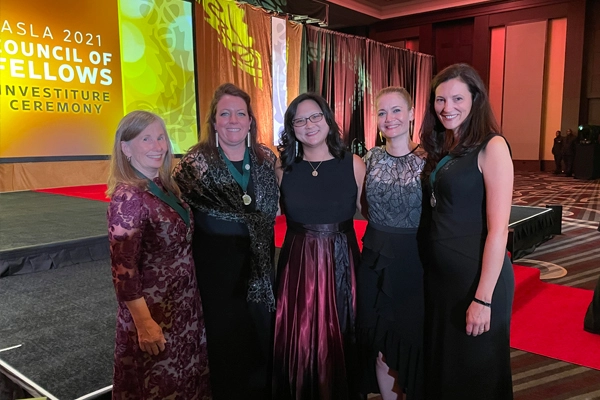 I had a lot of support from faculty at Ball State University in my formative years as a student, notably Martha Hunt, ASLA. I got involved with the Michigan Chapter of ASLA after graduating and had the benefit of excellent advice and guidance in leadership and for my career from two amazing, strong women landscape architects, Pam Blough, FASLA and Vanessa Warren, ASLA. As I became more involved in National ASLA, I've been so fortunate to have a group of inspirational women leaders who have been confidantes, cheerleaders, and unlimited supporters: Jeannie Martin, FASLA, Wendy Miller, FASLA, Haley Blakeman, FASLA, and Emma Skalka, Honorary ASLA. Finally, I am excited to join the ranks of the women ASLA Presidents, all of whom are inspirational and continue to promote the profession and serve as mentors for incoming leaders.