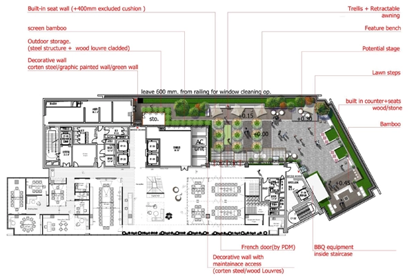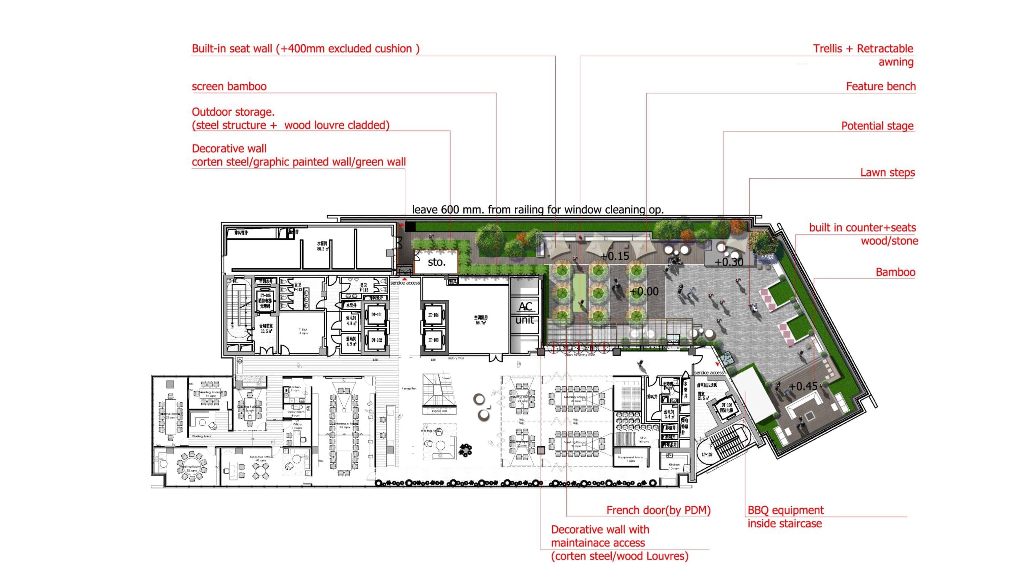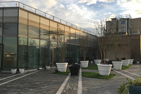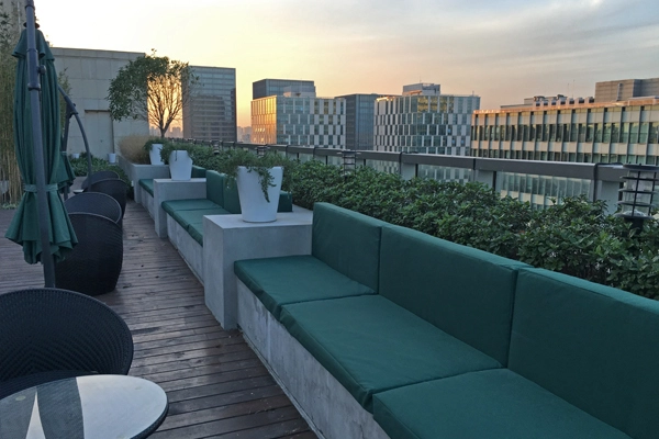 The initial design intent for the roof terrace was positioned for corporate activities adopting a vibrant and hospitality-style terrace. Designed by AECOM’s in-house hospitality landscape specialists, the original plans included a bar, barbeque area, fire pits, VIP seats, a stage, and space to locate a screen for films. Over-sized pots, candles, cushions, and gas heaters provided comfort and ambience for evening entertainment and corporate events.