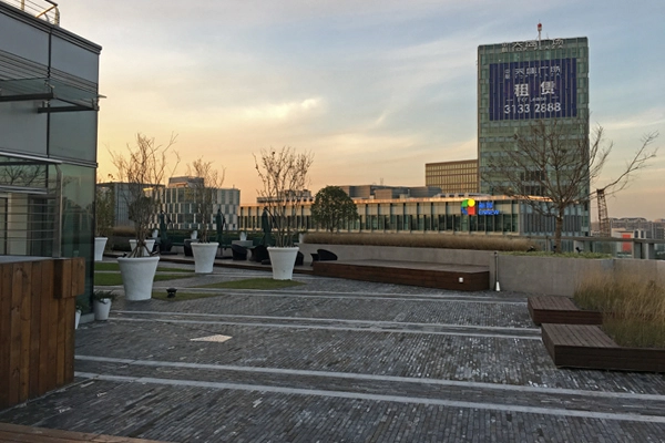 Raised seating was proposed to partially screen the parapet, leaving a 600mm gap from parapet to back of seat wall for window cleaning operations and building maintenance. Chinese grey-brick paving and wood decking add warmth. The Chinese grey-brick adds a cultural reference to Shanghai’s local vernacular drawn from the old ‘Shikumen alleys’ seen in the historic areas of the city. / image: courtesy of Lee Parks, AECOM