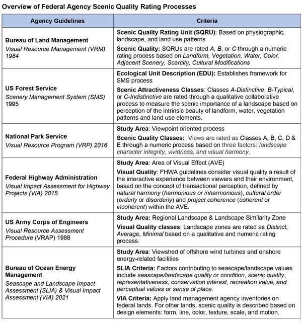 VRM is a systematic process that guides the context-sensitive siting and design of roads, utilities, forestry practices, and recreation activities by applying visual inventory and landscape design principles. The Bureau of Land Management (BLM)’s Visual Resource Clearinghouse site provides centralized access to federal agency guidelines and research, through coordination with the Argonne National Laboratory. VRM guidelines share a common ground in the core concepts and elements of landscape character, viewers, and scenic/visual quality; however, the specific terminology and criteria for VRM and VIA practices vary among agencies. In each case, methodologies were adapted to fit within each agency’s mission and responsibilities. The most variation among VRM methodologies occurs in the rating of scenic/visual quality, as summarized in the table below.