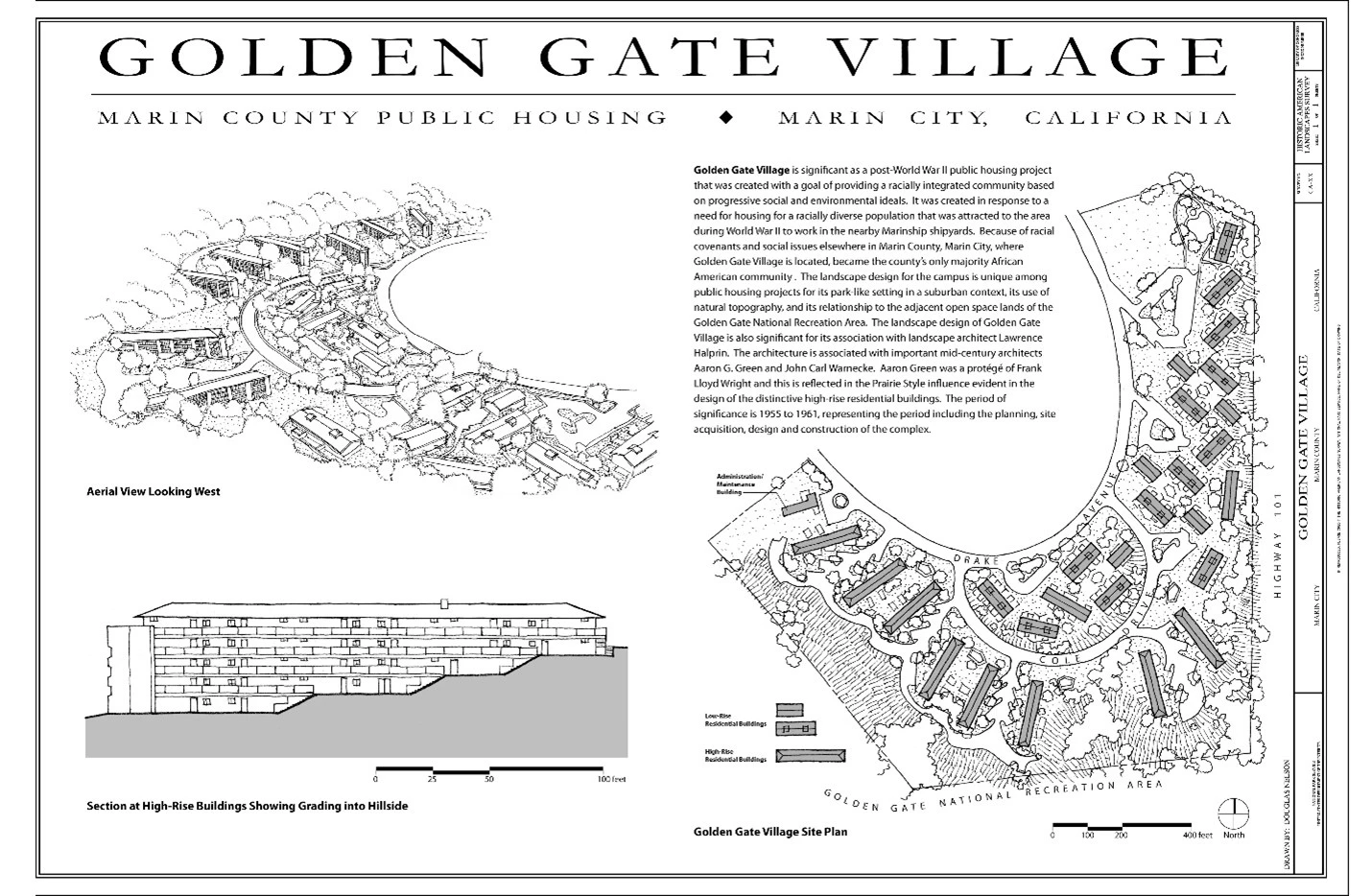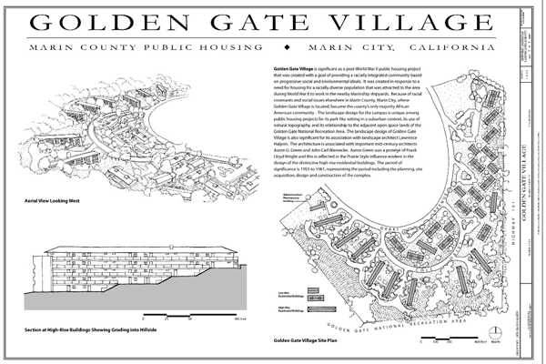 “California’s North Coast Redwood Parks are significant for preserving the best examples of magnificent redwood forests and the world’s tallest trees. It took foresight and stewardship to recognize that these forests would be lost to logging if active conservation efforts were not undertaken in the early twentieth century. Conservationists, including the founders of the Save the Redwoods League, saw the immense value and benefits of preserving these extraordinary natural places for future generations. Frederick Law Olmsted, Jr. played a key role by providing recommendations for the acquisition, management, and conservation of these parks; and for preserving the economic vitality of the region through sustainable yield forestry practices in areas outside of the parks.”Describing Your Landscape“Golden Gate Village is significant as a post-World War II public housing project that was created with a goal of providing a racially integrated community based on progressive social and environmental ideals. It was created in response to a need for housing for a racially diverse population that was attracted to the area during World War II to work in the nearby Marinship shipyards. Because of racial covenants and social issues elsewhere in Marin County, Marin City, where Golden Gate Village is located, became the county’s only majority African American community. The landscape design for the campus is unique among public housing projects for its park-like setting in a suburban context, its use of natural topography, and its relationship to the adjacent open space lands of the Golden Gate National Recreation Area. The landscape design of Golden Gate Village is also significant for its association with landscape architect Lawrence Halprin. The architecture is associated with important mid-century architects Aaron G. Green and John Carl Warnecke. Aaron Green was a protégé of Frank Lloyd Wright and this is reflected in the Prairie Style influence evident in the design of the distinctive high-rise residential buildings. The period of significance is 1955 to 1961, representing the period including the planning, site acquisition, design and construction of the complex.”
