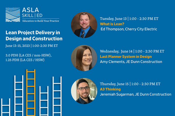 Module 3 | A3 Thinking - 1.0 PDH (LA CES/non-HSW) Thursday, June 15, 1:00 – 2:30 p.m. (ET) Speaker: Jeremiah Sugarman, Lean Services Manager, JE Dunn Construction Moderator: Shawn Balon, ASLA, Timmons Group