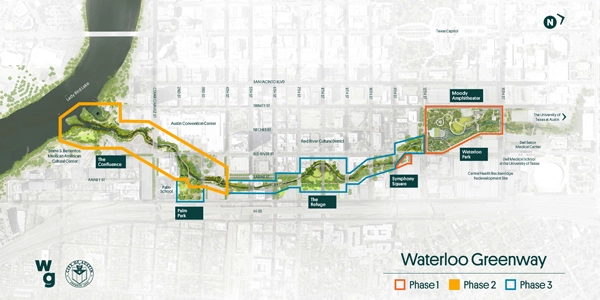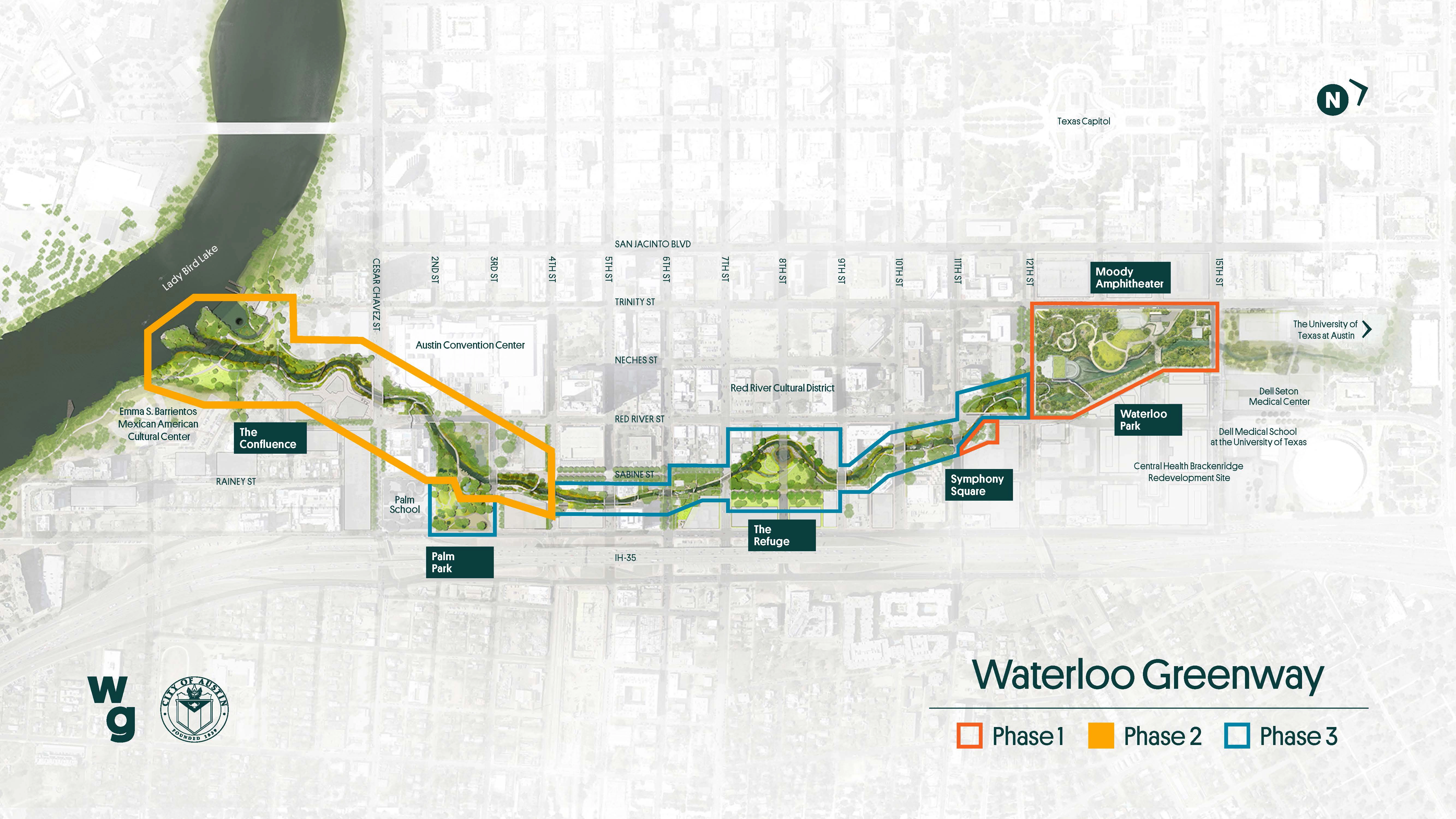 The rejuvenation of Waterloo Park and the restoration of Waller Creek running through it was the first phase in a multi-year public-private partnership between the Waterloo Greenway Conservancy (WGC) and the City of Austin to create a trail system and chain of parks from UT Austin to Lady Bird Lake.