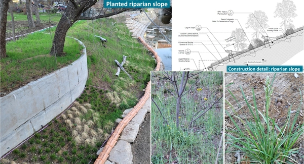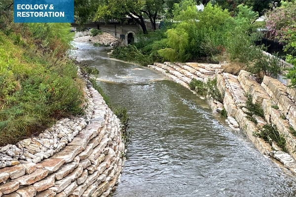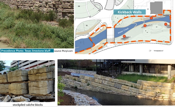 Although the preference in Austin’s creek restorations is for softer, green solutions this is not always possible. Due to the velocity of creek flows during rain events in this segment of Waller Creek and the proximity of an existing structure next to the creek, the designers included “kickback walls” of caliche limestone blocks, a sedimentary rock formed through a process of precipitation of calcite and other minerals, that is a waste product from local quarries. These bank-armoring walls are modeled after iconic limestone bluffs commonly seen in the Central Texas Hill Country to provide a more natural aesthetic.