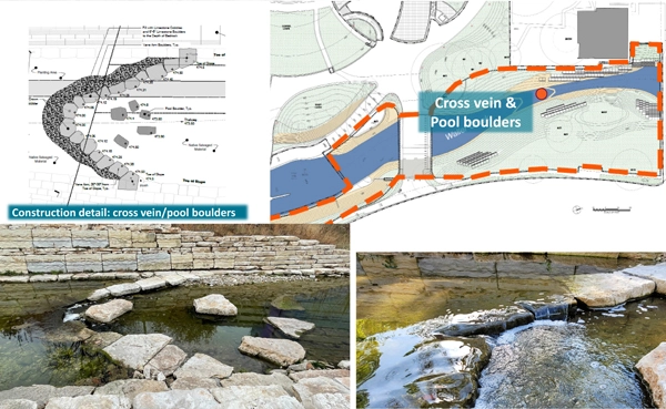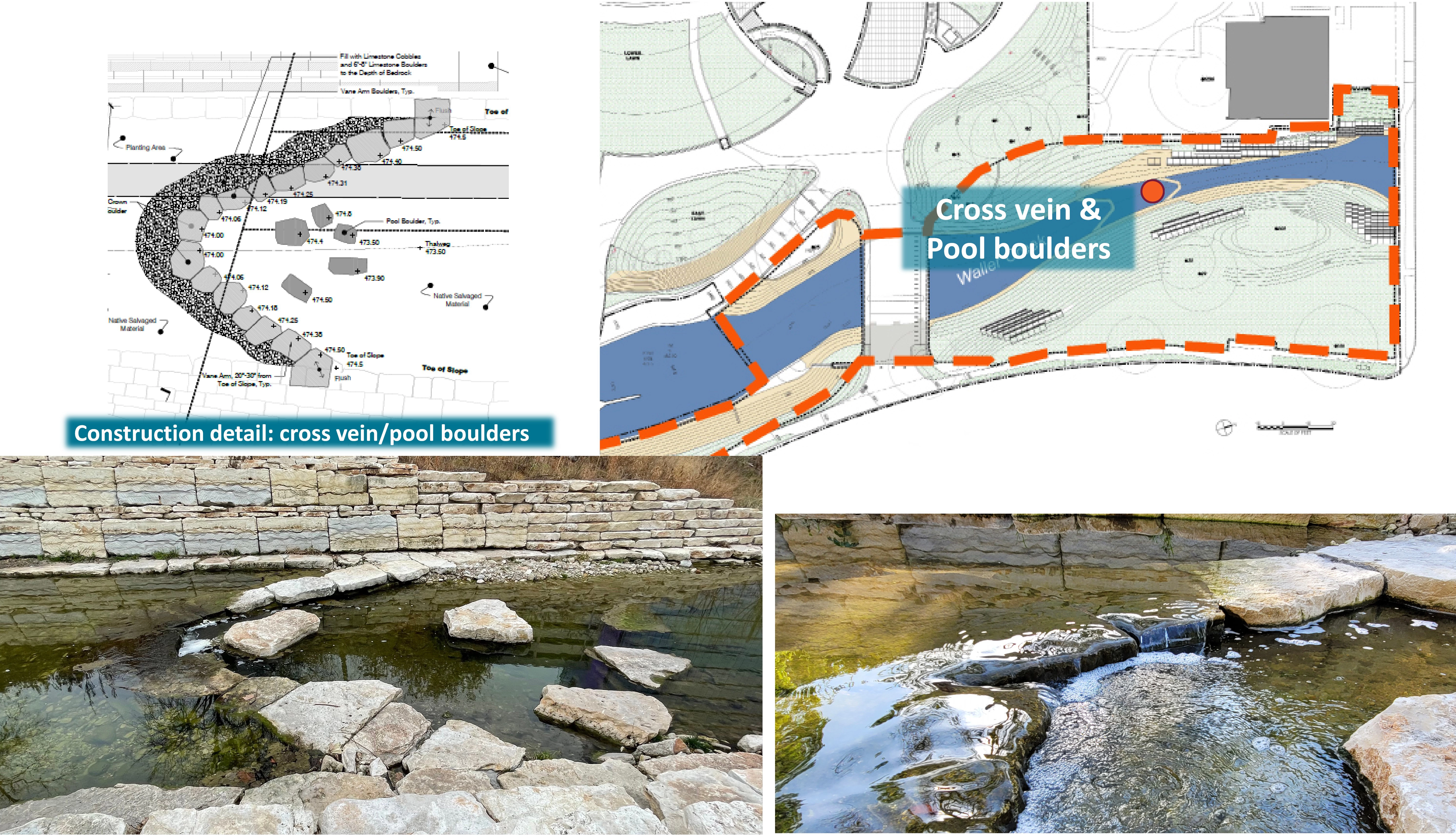 One cross vane and associated pool boulders were included. Cross vanes are stones placed in streams in the shape of a “C” or “V” to direct the water away from the banks and towards the center of a waterway, to decrease shear stress on the banks to prevent erosion. They also dissipate the stream’s energy during high flows.