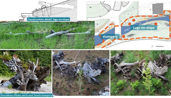 Trees removed for the project were salvaged and used on the slopes as woody debris. Woody debris, (aka logs-on-slope and stumpery) on the floodplain helps dissipate energy during high flow events, creates a nursery area for plant seedlings, a refuge and habitat for smaller wildlife and insects. As the wood decomposes, it’s a source of fungi, and adds organic matter (carbon) and nutrients into the soil.