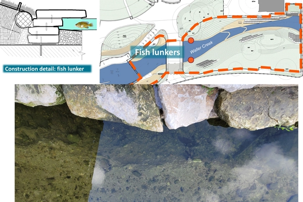 The plan for the creek restoration in Waterloo Park incorporated many elements shown in the diagram above: deep pools, rock lunkers, cross vane, and emergent logs, plus revegetation with Central Texas native and adapted plants.