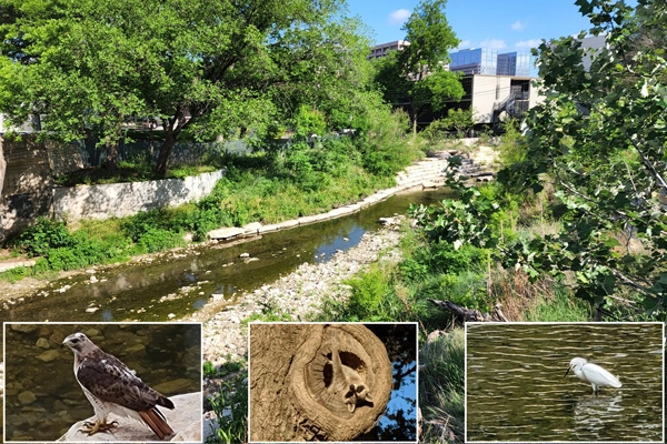The results from two years after construction are striking. No longer a neglected section of creek, the restored portion of Waller Creek in Waterloo Park is a healthier, verdant creek and riparian area where one can find fish, turtles, hawks, raccoons, and great blue heron catching a meal, among other wildlife.