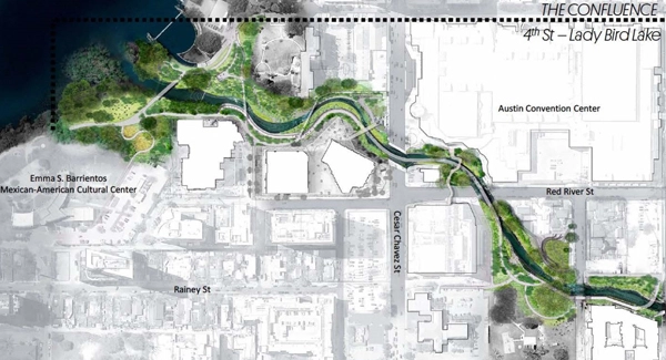 The next phase of the Waterloo Greenway, The Confluence, will be in the bottom of the watershed and will connect 4th Street to Lady Bird Lake. It started construction this year, building the lessons learned and techniques used during Phase One in Waterloo Park.