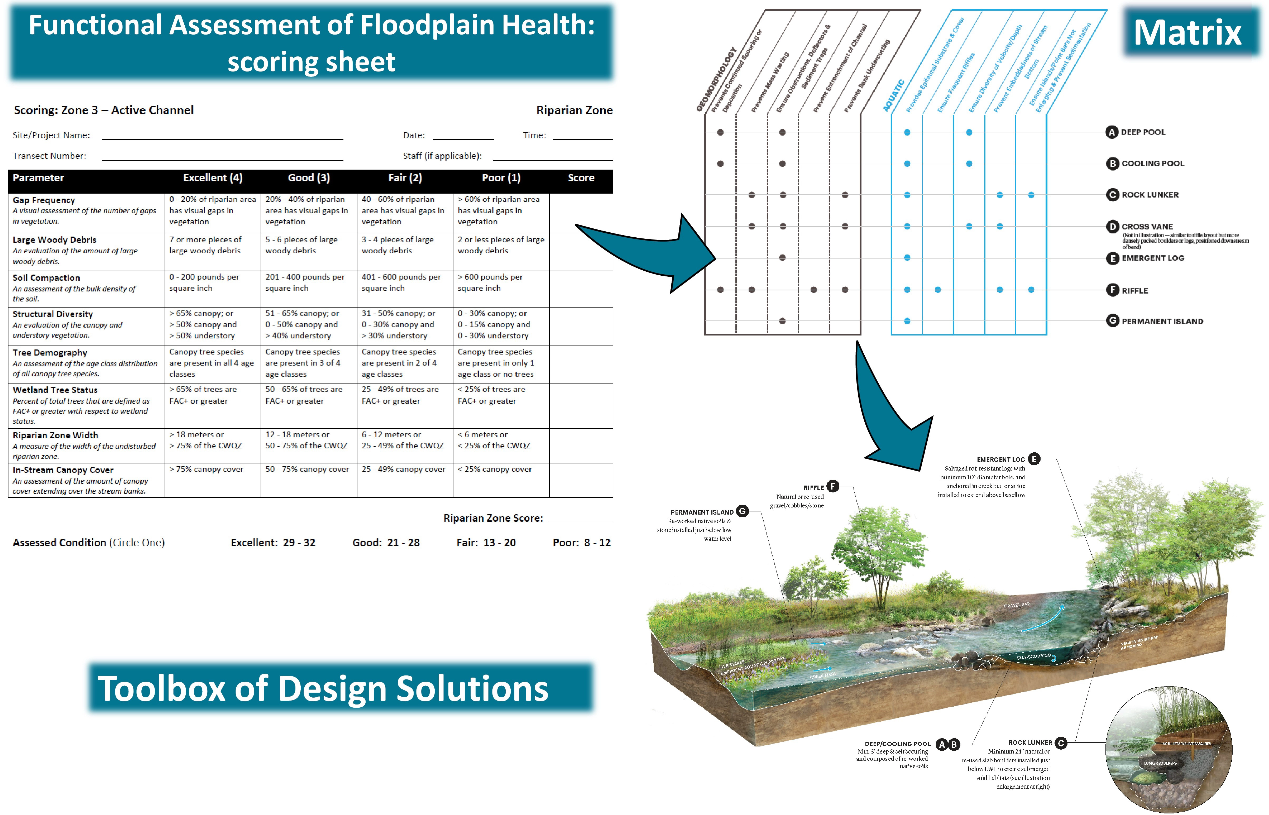 The design team, along with the Conservancy and the City’s Technical Advisory Group developed a Creek Corridor Framework Plan, the result of over a year of in-depth analysis and data collection as a high-level planning document to guide the more detailed planning. The interdisciplinary team of experts came from diverse disciplines: landscape architecture, engineering, biology, park operations, lighting design, and more. The document’s 10 design principles and priorities were founded on functional criteria that characterize a healthy stream as defined by the City of Austin’s Watershed Protection Department’s regulatory tool called the Functional Assessment of Floodplain Health. The intent of this assessment was to provide a simple, accurate, and locally derived tool that could be used to record a pre-project baseline and, later, to assess post-restoration success. The goal of this tool is to raise the pre-construction functional assessment score of a project area from low to higher, from say poor to good or better, thereby achieving ecological functional lift. The design team took the parameters from the tool and developed a “toolkit” of design solutions that provide a common language of stream restoration techniques across disciplines based on elements of natural channel design.