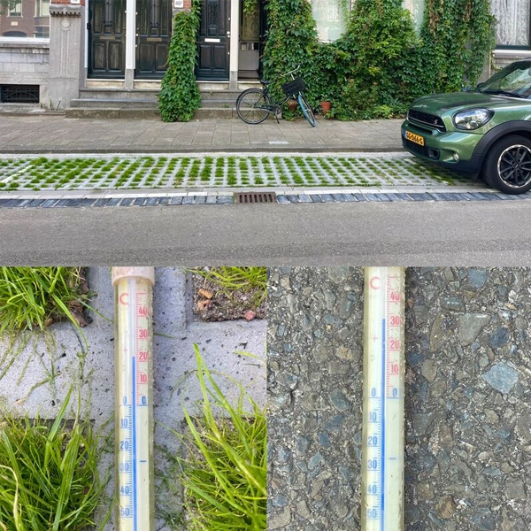 Climate-adaptive parking in Rotterdam, the Netherlands, and the temperature difference between permeable vs. impermeable surface / image: courtesy of Gina Kranendonk via LinkedIn