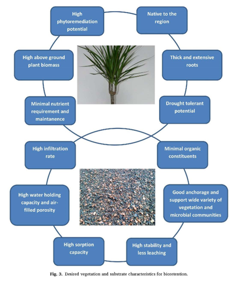 Muerdter, C, C Wong, G LeFevre. 2018. Emerging investigator series: the role of vegetation in bioretention for stormwater treatment in the built environment: pollutant removal, hydrologic function, and ancillary benefits. Environmental Science: Water Research & Technology 4(5) DOI:10.1039/C7EW00511C.