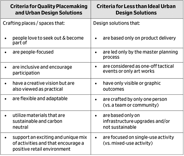 F. Successful retail environments will ultimately need to provide for all the above factors and then meet the additional criteria for making quality places that various populations want to visit and spend time in. This challenge can be referred to as the ultimate challenge for planners and designers practicing as urban designers. It can be referenced as the important criteria of placemaking from an urban design point of view explained in the following comparison chart: